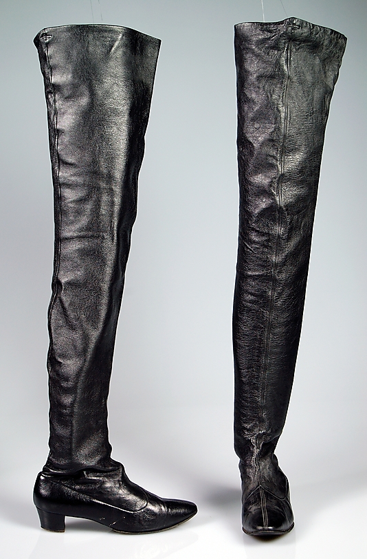 This is particularly true for the ultra-tall, thigh-length boots that formed the core of his work during this period. A couple of examples from the Brooklyn Museum Costume Collection at the Met are featured here. If you look at the brown vinyl pair above, you’ll see a couple of small loops at the top of the shaft. These were designed to connect to a suspender belt, the only way these boots could be held up. They were a demanding style to wear.