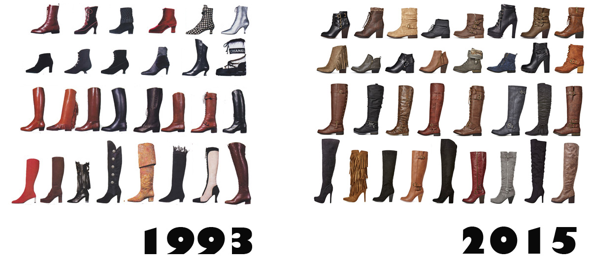 But… they’re not identical. First, compare the knee length boots in the 3rd row. The 1993 boots have very clean lines. By contrast, the 2015 styles are a mass of straps, studs, and buckles. Also, the nineties riding boot often has a recurve at the top of the shaft that mimics a real equestrian boot. The 21st Century variant is usually widest at the top, as befits a boot that is often worn over jeans. In the early nineties, the “riding” boot was still predominantly worn with long skirts or leggings.