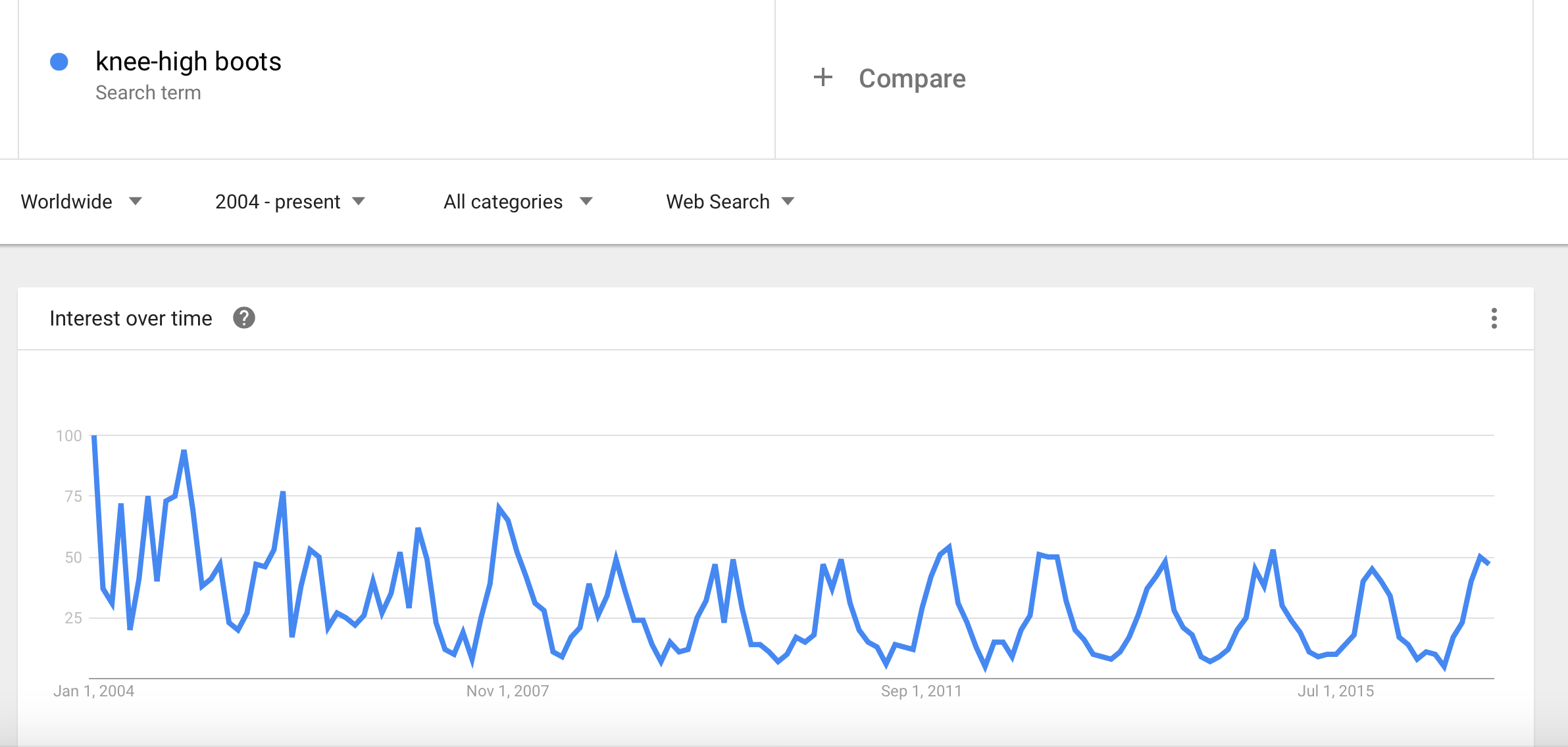 Now look at the term “knee-high boot.” At first glance, the two patterns look more-or-less the same, but if you inspect it more carefully, you can see that there’s a slight decline in popularity from 2004 to 2007, which – I think – reflects the decreasing popularity of the dress boots that dominated fashion around the turn of the millennium.