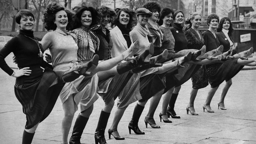 If you look along the kickline for 1970 it’s pretty much as you’d expect (assuming you’ve been following this blog and/or reading the book); close-fitting boots, low-heeled, some rising above the knee. The line is very long and the resolution is none too great, but I’d take a guess that about 1 in 3 of the dancers is in boots. By 1976, that number is just shy of 50%; the heels are of the higher, stacked variety and there’s now a mix of the straight-legged, “baggy” boots with the calf-hugging ones. Jump forward a year and we still have an almost 50:50 split of shoes and boots. The boots are now almost all straight legged and the heels, while still high, are beginning to acquire a taper.